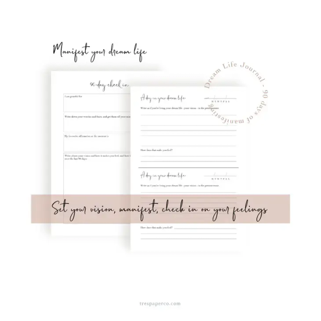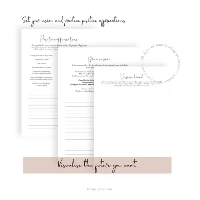 You will write what you would like to manifest, as if you’re already living it. This journal comes with guided pages for you to record your dream life for 90 days, as well as space to set your vision and positive affirmations.